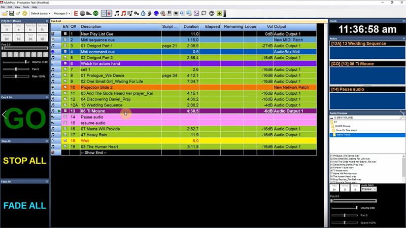 支持复杂的音效编排,如按需播放多条音频线索(Audio Cue),可预设淡入(Fade in)、淡出(Fade out)效果,并实现多音轨同时播放(如背景音乐与声效叠加)。